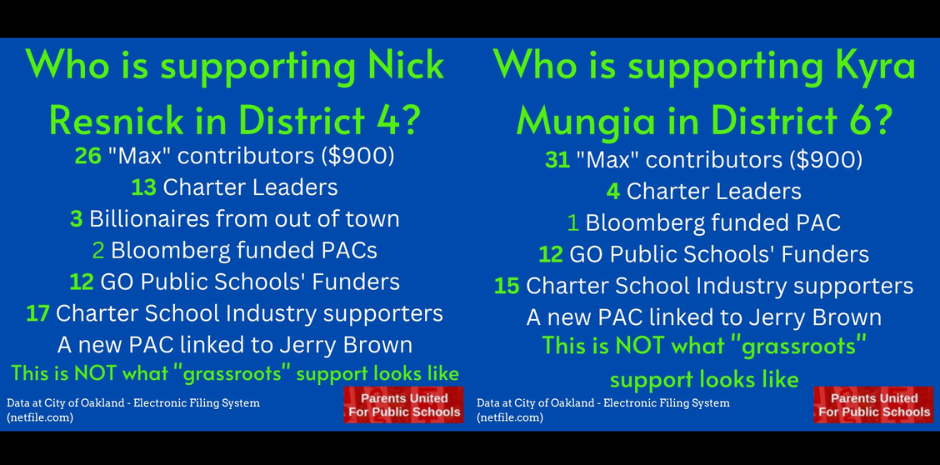 There is a lot of talk right now in Oakland School Board Electoral Politics about what it means to be a “charter candidate”. Both Nick Resnick and Kyra Mungia proclaim that they are not “charter candidates” because they don’t support adding new charter schools, but despite that, they are supported by Charter School Leaders, Charter … Continue reading What does it mean to be a “charter candidate”?