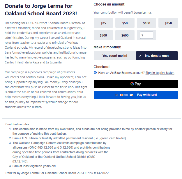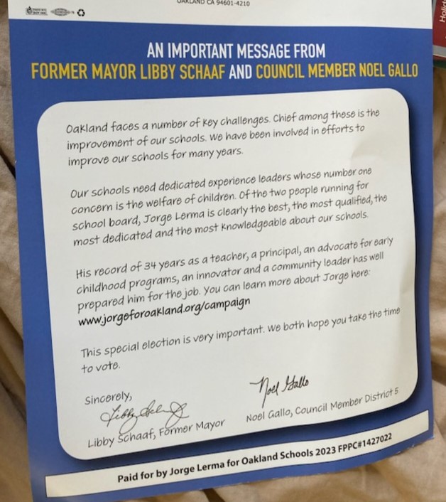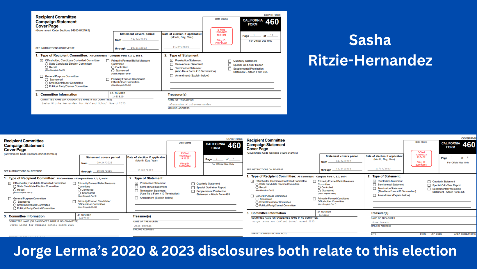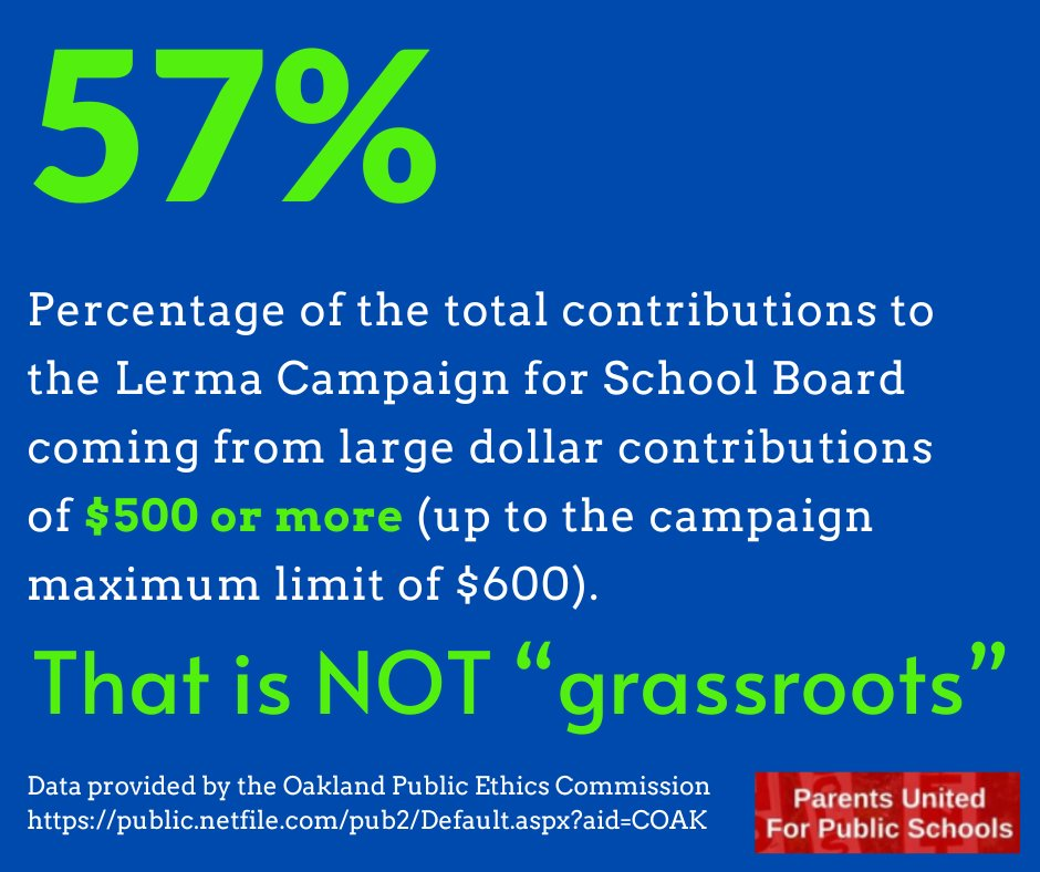 In 2016, GO Public Schools and the California Charter School Association (“CCSA”) spent an astonishing $785,000 in 4 races (while OEA spent less than $25,000), and the charter backing GO/CCSA slate won all 4 seats. By 2020, the charter alliance spending (flush with $500,000 from former NYC Mayor Michael Bloomberg and more from CCSA) of $678,500 still dwarfed the teacher spending ($250,000), but 3 of 4 teacher backed candidates won seats on the board. It was clear that voters trust their teachers and workers, and do not want out-of-town billionaires deciding what happens in our schools. The charter alliance clearly understood that their super PAC strategy no longer worked in Oakland, and so they have changed tactics. There may still be billionaire backed PAC spending to come late (so as to hide it as long as possible) but in the meantime, the local charter industry supporters have thrown their money directly to Mr Lerma’s campaign.