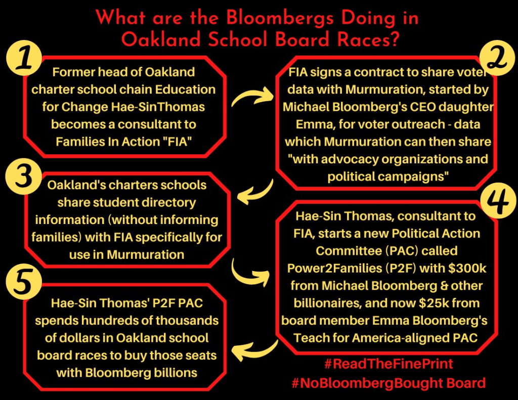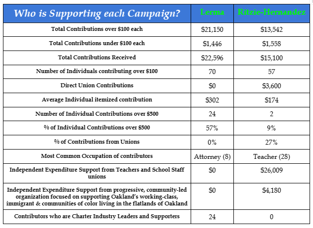 Ms Ritzie-Hernandez raised $13,542 total, $3,600 from 3 unions (plumbers, laborers and SEIU classified staff) and 57 individual contributions averaging $174 per contribution, plus $1,558 in small donations. Most of her contributions come from teachers and just 9% of total funds raised came from contributions of $500 or more. Ms Ritzie-Hernandez does benefit from spending by the unions of OUSD teachers and staff as well as the Oakland Rising Action PAC which is “a community-led political organization focused on supporting candidates and issues that drive a progressive agenda for Oakland’s working-class, immigrant and communities of color living in the flatlands of Oakland.3” There is a significant difference between spending by PACs which are fully funded by out of town billionaires like Michael Bloomberg and Stacy Schusterman who know nothing about Oakland’s kids, and spending by local unions and progressive groups who work every day with Oakland students and families.