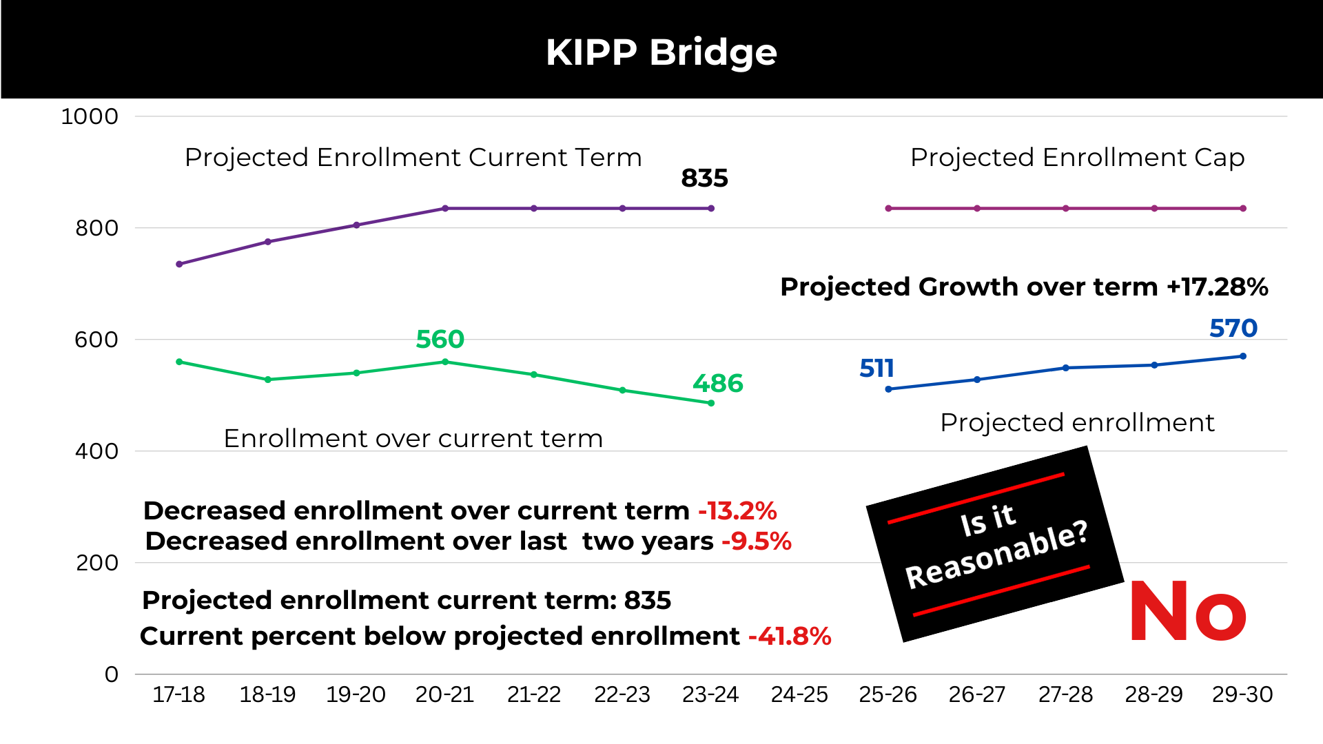 For the charter school to be now projecting an increase in enrollment over the next 5 years of more than 17% is unreasonable on its face, and this board should not approve this charter unless those numbers are changed, which at this point requires that KIPP Bridge withdraw their petition and start over. Simply substituting new numbers for old numbers will not fix the problem, the fiscal analysis and program offerings will still be based on the prior, patently unreasonable numbers. If KIPP Bridge insists on pushing forward with this petition5 OUSD must deny the renewal petition.