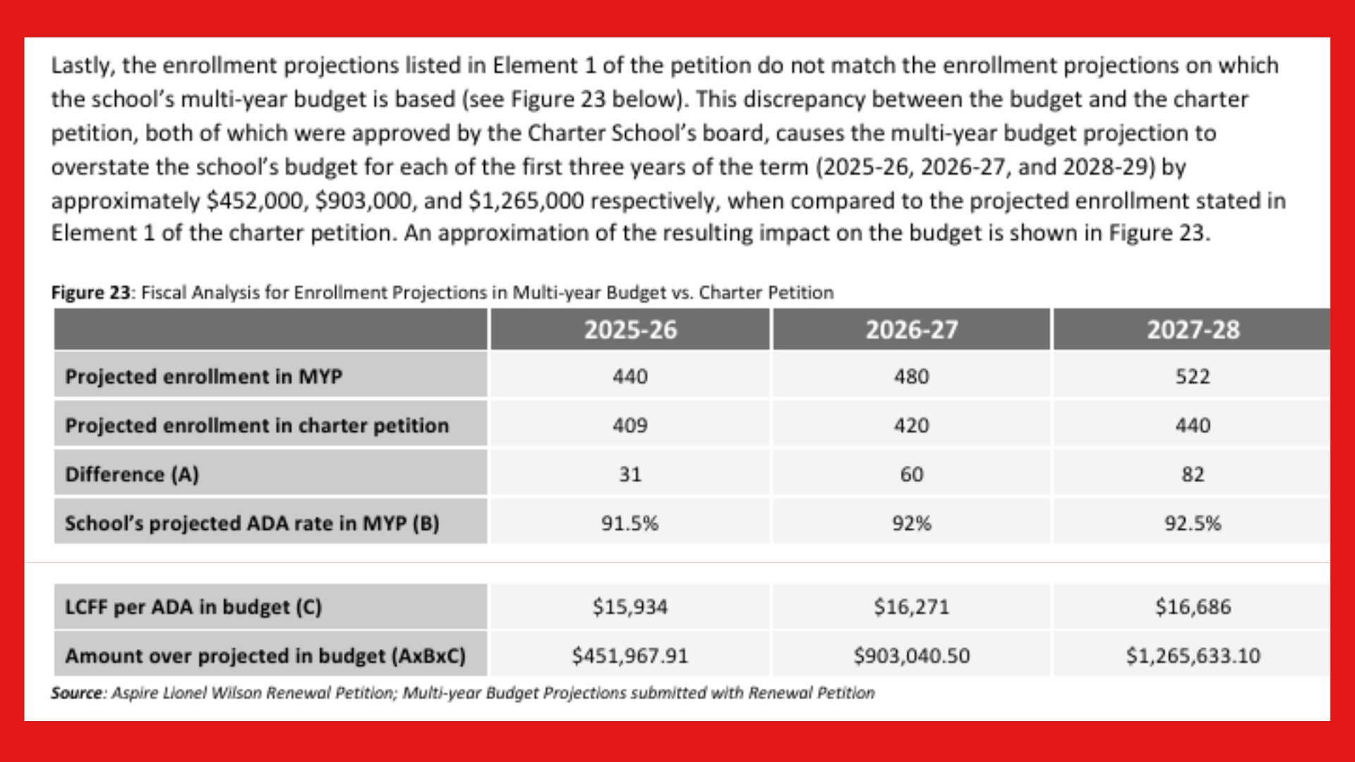 The OUSD staff report for Aspire LWP had a fairly in depth discussion about the unreasonable enrollment projections, stating that the petition “does not accurately project the financial reality for the 2025-26, 2026-27, and 2027-28 school years” and further that the projections as stated in the petition and the assumptions of the Multi-year budget did not match, resulting in an even greater over projection of revenue: