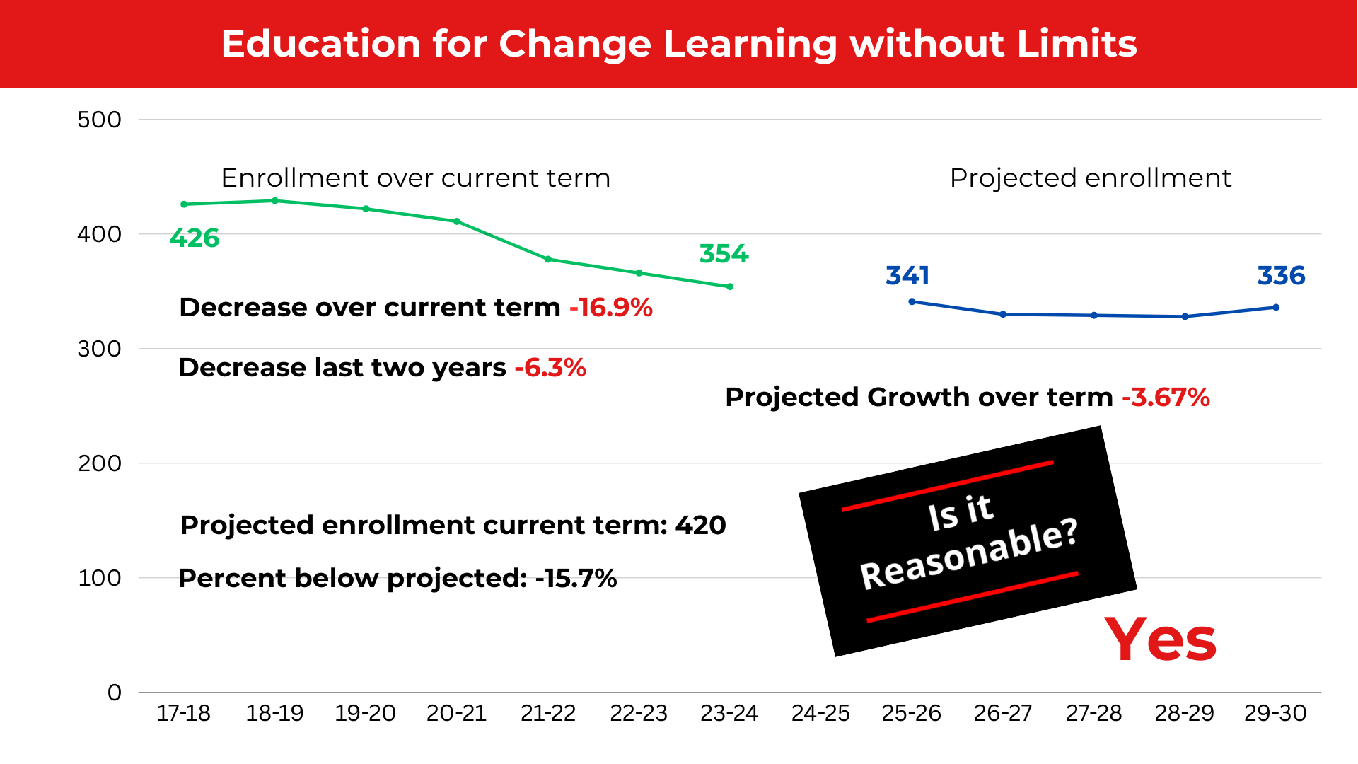 EFC Learning without Limits is projecting a slight decline in enrollment, which is reasonable and consistent with its history. However, the charter school identified the “maximum enrollment” as 420, which is NOT reasonable, and the board should require EFC to change that to the 341 maximum enrollment specified in the contract. This is an attempt by this and two other charter schools (KIPP Bridge and Unity High School) to circumvent the following OUSD oversight language in the charter petition”