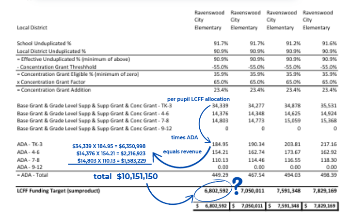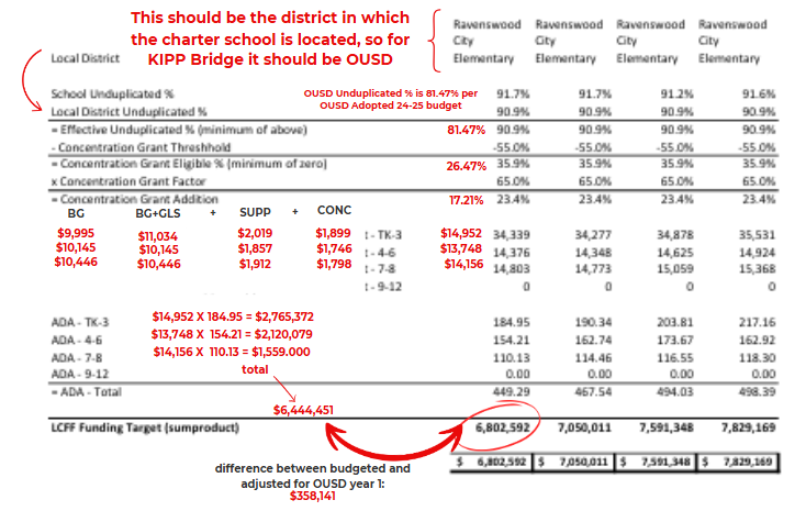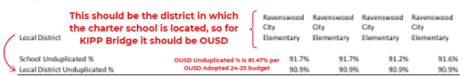 In the LCFF Calculator submitted as part of the KIPP Bridge charter petition, KIPP Bridge lists “Ravenswood City Elementary District” as its “Local District”. That is clearly an error – the “Local District” is the district in which the charter school geographically resides and should be OUSD.