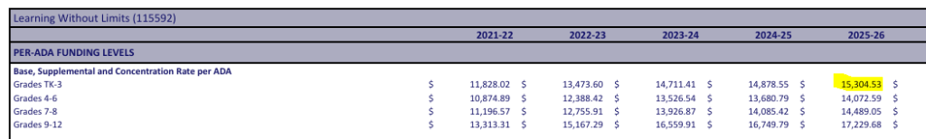 Any financial professional or charter office staff member should have immediately caught that mistake. By contrast, the EFC Learning without Limits petition identifies as the state allocation $15,304.53 per ADA for 2025-26.