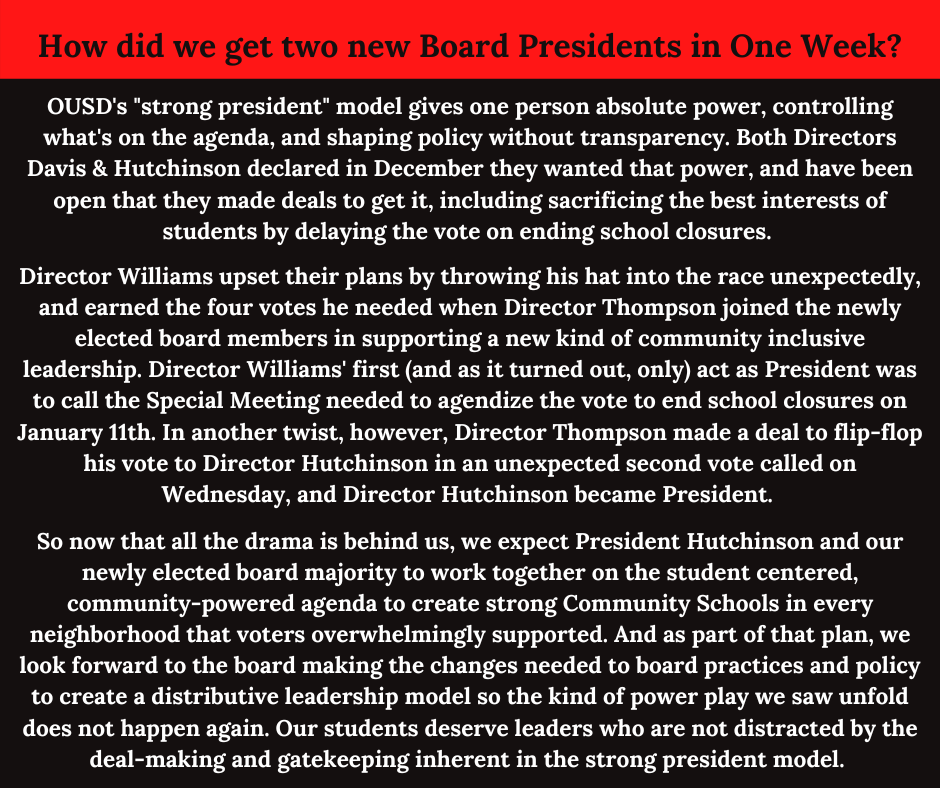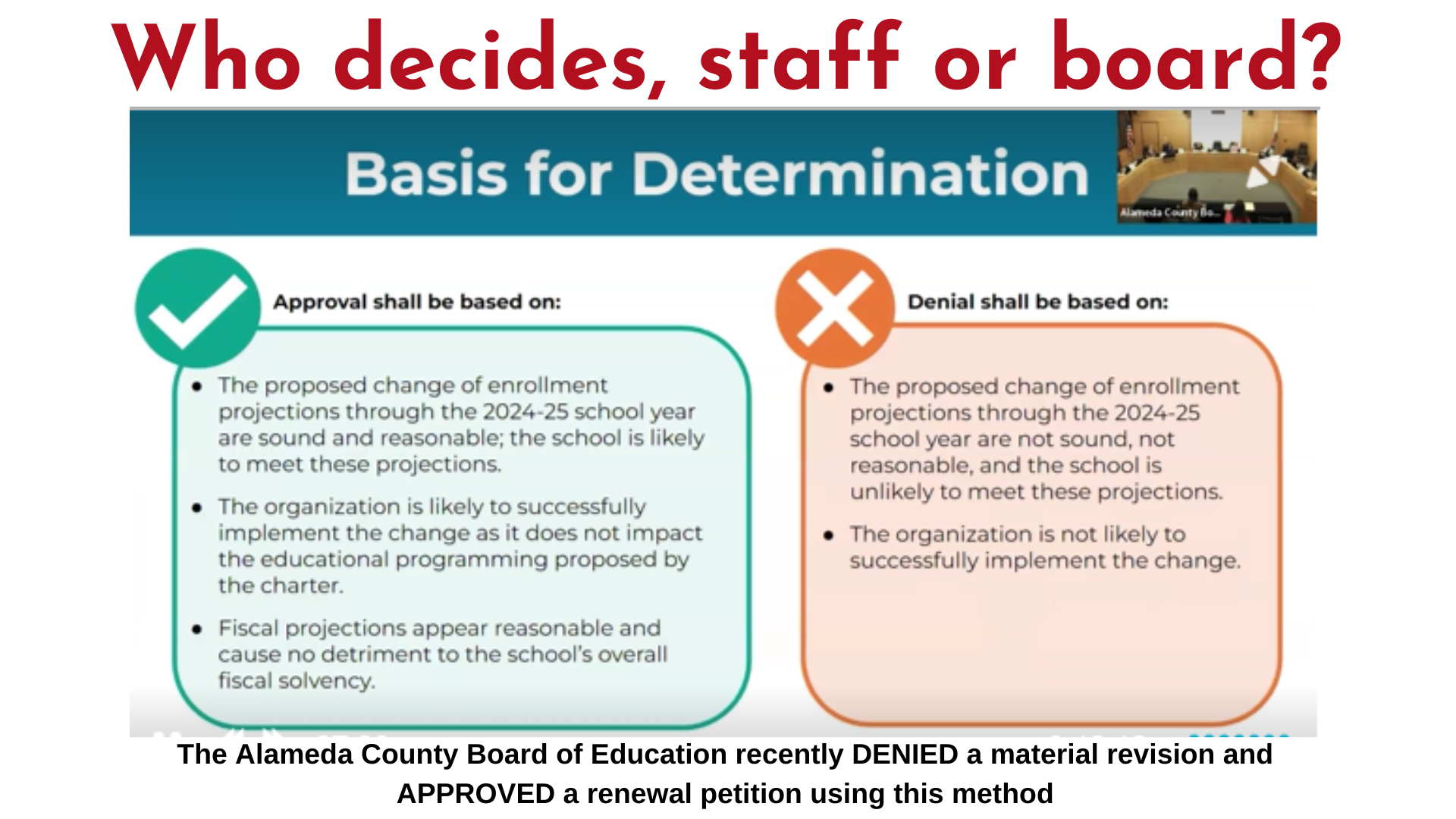 Pre-pandemic, OUSD ran into this problem several times, where the staff had recommended approval of a charter petition and the Board decided not to approve, but then had to scramble to get staff to create the necessary findings that they could then approve. In response to that, former board director Shanthi Gonzales sought to change policy to ensure that didn’t happen. Instead, the charter committee, led by Director Hutchinson, left the policy in place.