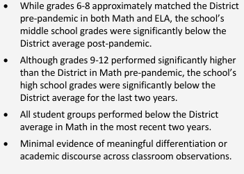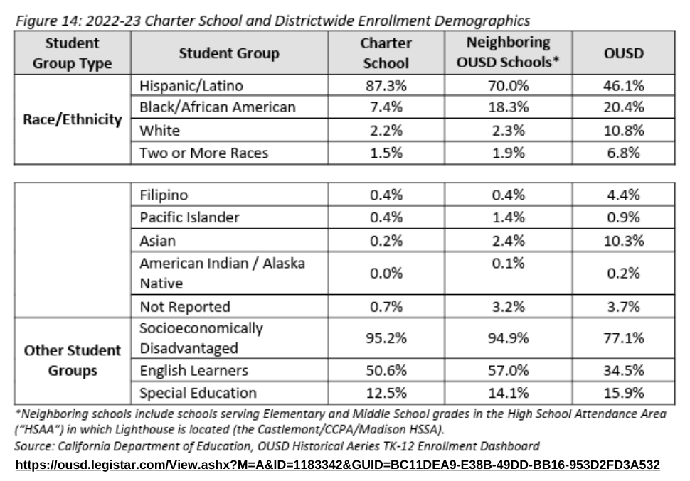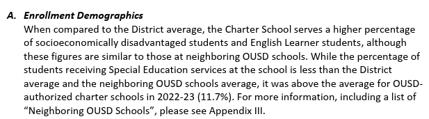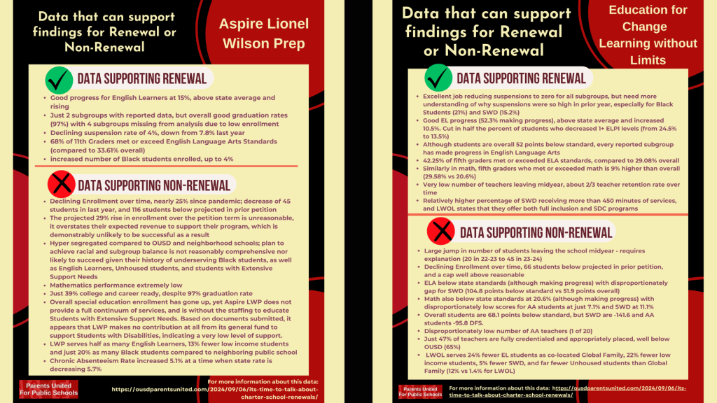 We are not off to a promising start. The two first schools up for renewal are Aspire Lionel Wilson Prep (LWP) and Education for Change (EFC) Learning without Limits (LWOL), which had their public hearings on August 28, 2024. In that meeting, four board members1 asked some important and detailed questions about special education, staffing, demographics, enrollment, newcomers and English Learners as well as academic preparedness. The charter school leaders weren’t asked to respond on the fly, but were given the questions in writing in order to provide more information. Both charter schools have addressed a few of the questions in their presentation that is posted on the OUSD website2 but most of the specific questions have not been publicly responded to. It seems that the charter industry is not happy with this level of accountability, complaining to President Sam Davis and probably others that the board was asking too many questions. No doubt threats of lawsuits will follow, as they have in the past, intended to intimidate board members and staff into backing off of this increased level of oversight for charter schools used to operating opaquely and without accountability for serving all students well.