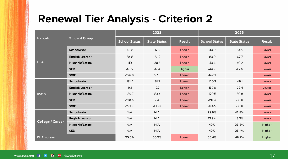 In the staff reports that the charter school staff prepared for both EFC LWOL and Aspire LWP there is an in depth analysis of the petition, academic successes and challenges, and facts that could support legal findings to renew and also to deny. Because it is a middle tier, that is exactly what you should expect, and then it becomes the job of the governing board to decide if the charter should be renewed or not. It is not the job of staff to make that determination, but the authorizing board. That is how the Alameda County Board of Education does it, and that is how OUSD should do it, but doesn’t.