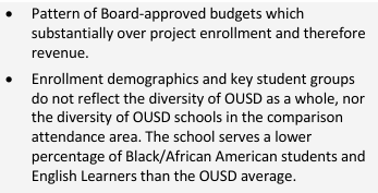 OUSD started off strong with changing the expectations around charter renewal. The former head of the charter school office Sonali Murarka had been making clear to charter schools at renewal that they must move significantly toward serving ALL students – demographic groups, English learners, students with disabilities, low income students – or they would not survive renewal. At a board meeting for Francophone charter school, the new executive director warned his board that if they did not change their demographics to serve more low income and students with disabilities that they would be non-renewed. Charter schools were clear on what the new expectations were.
